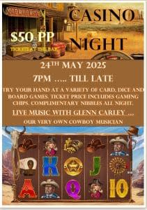 Get a ticket today .... your ticket includes your gaming chips and canapes served all night. THEME is THE WILD WEST ... spot prizes for best dressed.