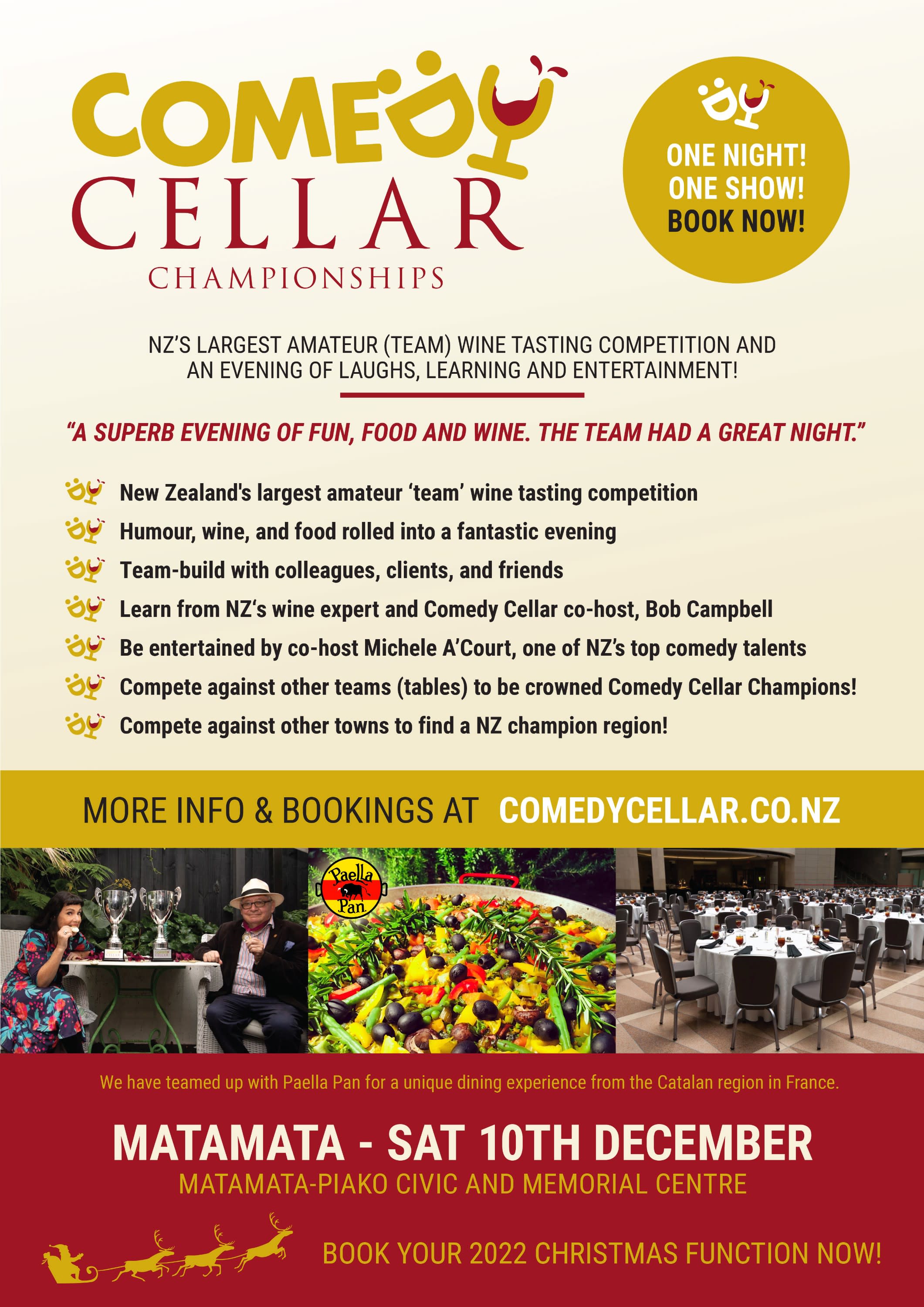 Comedy Cellar, New Zealand's largest (amateur) team wine tasting competition and a massive night of laughs, learning and entertainment comes to Matamata. Comedy Cellar pits local teams (tables of 8-12 persons) against each other for the title of Comedy Cellar Wine Champions Matamata. Several wines are served blind at your table, and several weighted questions are asked about each wine. Teams must agree on one correct answer to submit to the judge until a local champion is found and celebrated. After a local champion team is found, all of the Matamata's teams scores are then averaged and compared to other New Zealand towns to find the country's best wine drinking town! So not only are you competing against other local businesses, friends and colleagues on the night, collectively, you are one big team competing against other towns and cities around New Zealand (the leader boards and results can all be tracked on the website)! Comedy Cellar is co-hosted by Bob Campbell (NZ's foremost wine expert) and Michelle A'Court (one of NZ's top entertainers) and is a great evening of entertainment, competition, laughs and a bit of learning. The evening includes tasting wines and dinner, and additional bar service is available during the evening. See the website for full details: www.comedycellar.co.nzImages