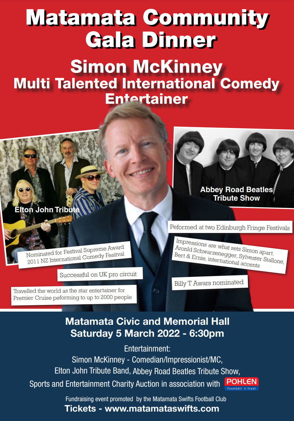 This is a community event featuring comedy, music and a sports and entertainment charity auction. Entertainment includes Simon McKinney - Comedian/Impressionist, Elton John Tribute Band, and Abbey Road Beatles Tribute Show. Dinner is included and a bar will be open. Funds raised from this event will contribute towards the cost of upgrading the lights at the Domain, which will benefit all members of the football club, along with other community groups. Funds will also be shared with the Pohlen Foundation Trust.Images