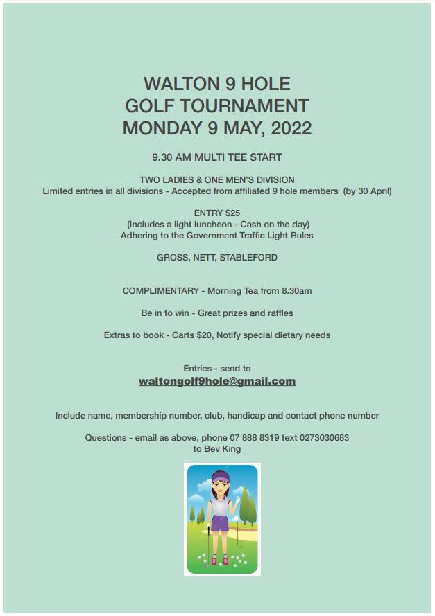 TWO LADIES & ONE MEN’S DIVISION Limited entries in all divisions - Accepted from affiliated 9 hole members (by 30 April) ENTRY $25 (Includes a light luncheon - Cash on the day) Adhering to the Government Traffic Light Rules GROSS, NETT, STABLEFORD COMPLIMENTARY - Morning Tea from 8.30am Be in to win - Great prizes and raffles Extras to book - Carts $20, Notify special dietary needsImages